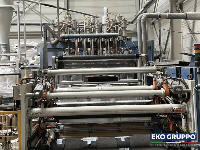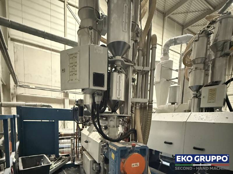 The 3 layers Dolci High Speed FCL 1500 Stretch Film Line allow to produce stretch wrap film with high quality winding. This used cast film extrusion machine gives to customers efficient stretch film production capability with a film width of 1,5 mt and an output rate of up to 600 kg/h. Completely automatic, suitable for automatic rolls.
